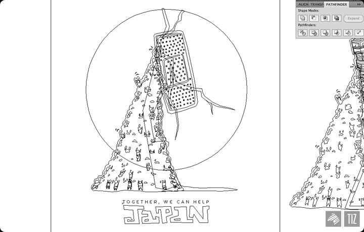 ↑ Concept outline. Keeping the group of people (may not look like people at this point, but I promise it’ll look more decent), but they are now applying a giant band-aid on the crack of the red sun – the most apparent symbol of Japan.
