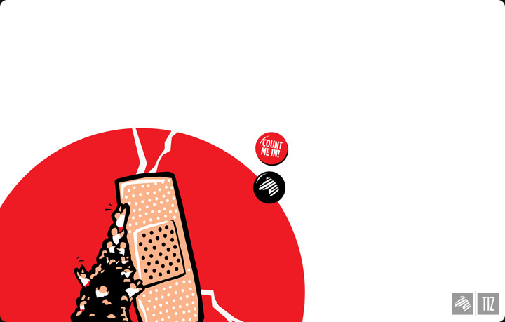 ↑ Using Tokyo tower as a symbol of Japan, people group together to help support the bending tower.