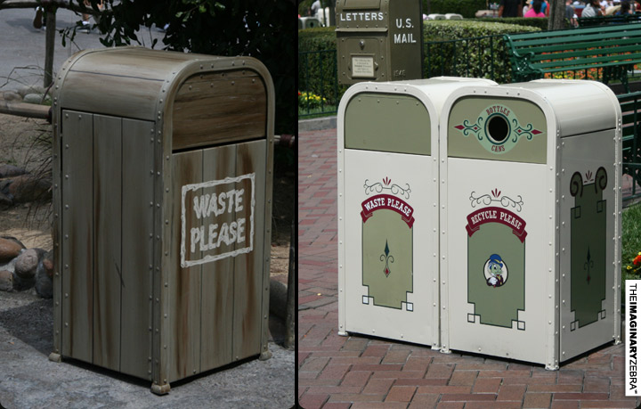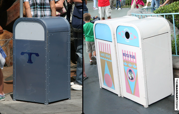 Garbage cans. Each section has their customized trash cans. But wait, check out the rims of their recycle ones.